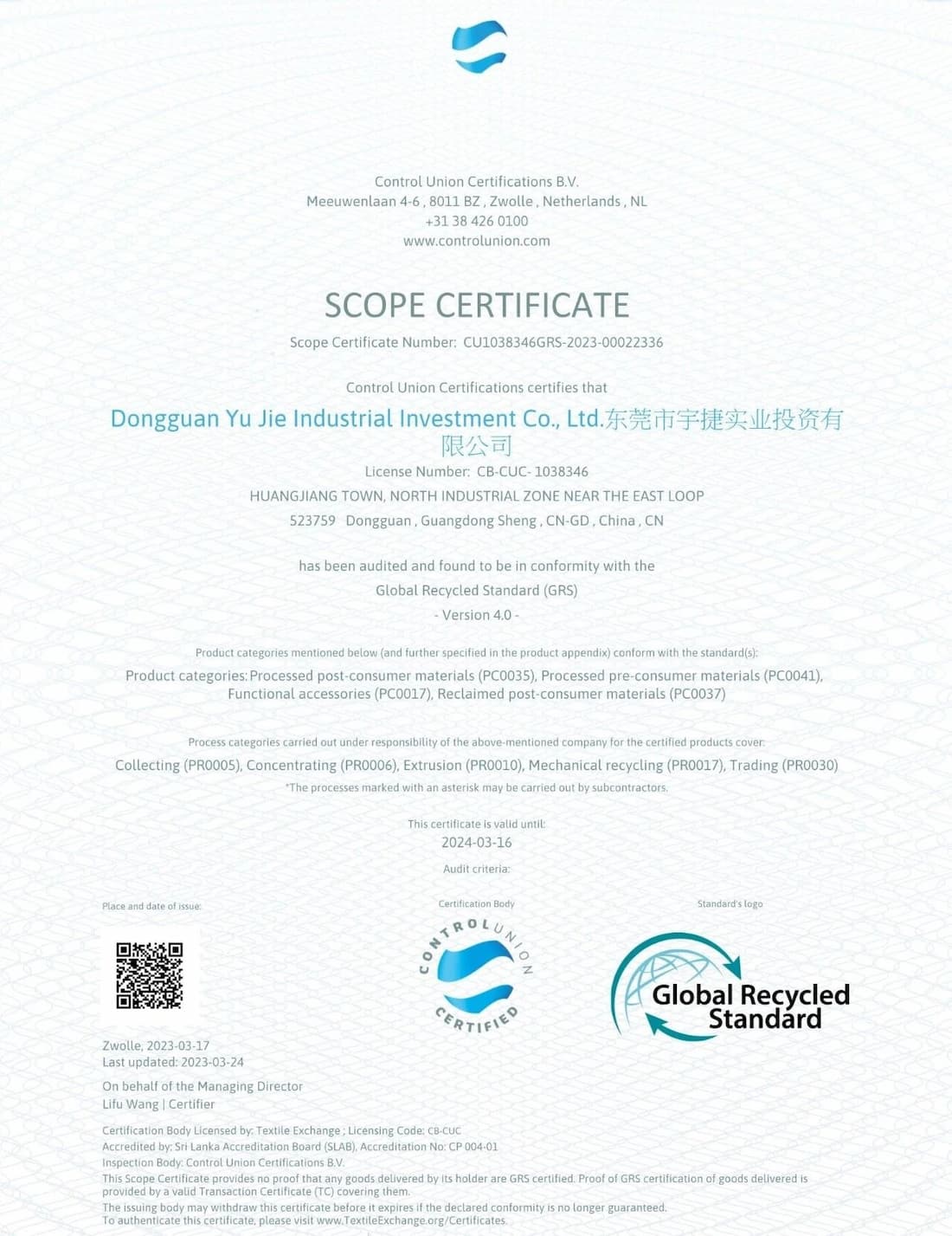 Yujie PCR a passé les certifications GRS, OBP, UL2809, ISCC et d'empreinte carbone.