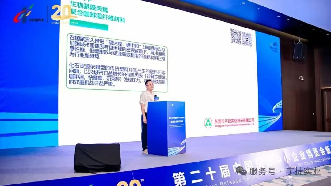 En tant qu'entreprise représentative du SSDN au niveau provincial, Dongguan Yujie Industrial Investment Co., Ltd. (ci-après dénommée Yujie Industrial) a présenté sa dernière innovation en matière de recherche et développement – un matériau composite en polypropylène biosourcé à base de fibres de marc de café – lors du salon. L'entreprise a eu l'honneur de présenter ce produit novateur sur la scène officielle de lancement de nouveaux produits, et de le faire découvrir, ainsi que ses applications concrètes, à un public international grâce à des échanges avec les médias et des diffusions en direct.