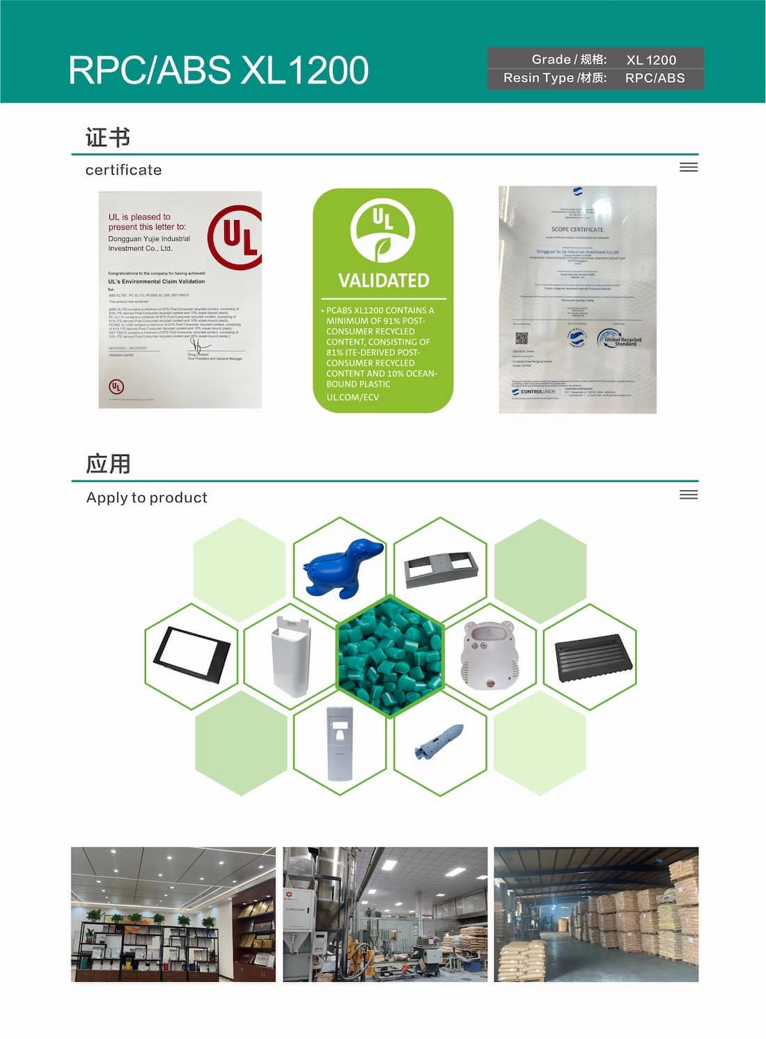 Le Yujie Industrial RPC/ABS ou PC/ABS recyclé (PCR-PC/ABS) est un alliage respectueux de l'environnement fabriqué à partir de matériaux recyclés post-consommation par modification.